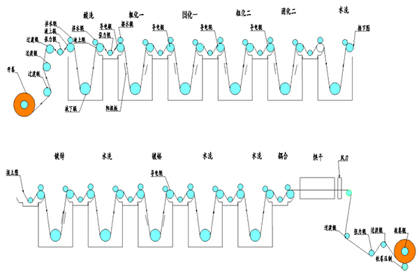 上述表面處理機,以生箔機生產(chǎn)的電解銅箔為主要原料,經(jīng)放卷―酸洗―粗化1―固化1―粗化2―固化2―粗化3-固化3-水洗―鍍鋅―水洗―鍍鉻―水洗1―水洗2―硅烷―烘干―收卷處理工藝,能夠生產(chǎn)出符合IPC-4562要求的電解銅箔。(工藝槽數(shù)客戶可指定)