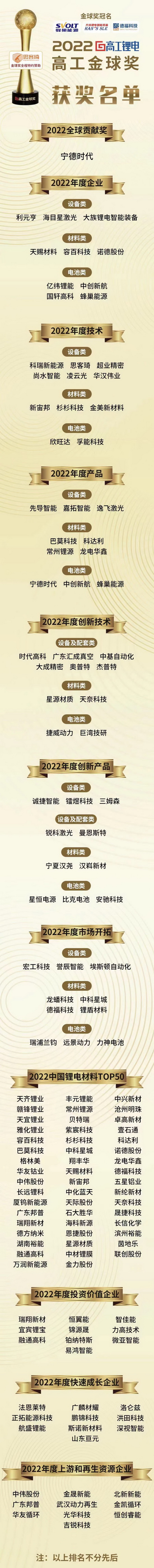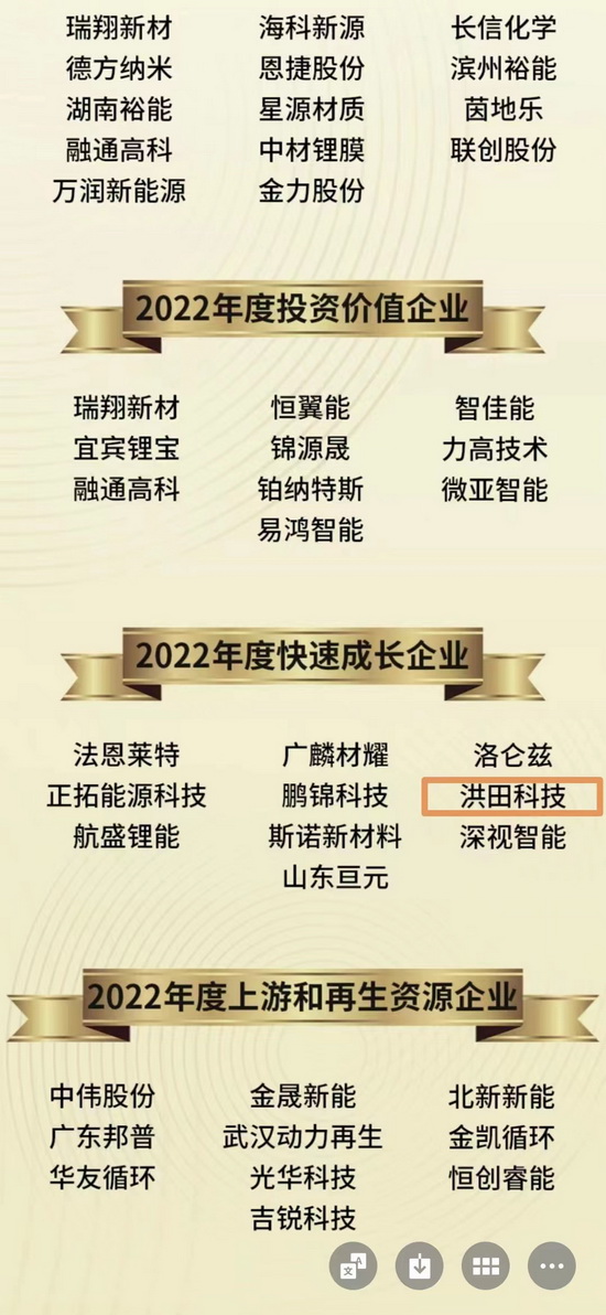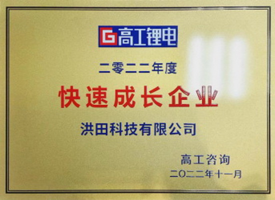2022年11月16日,以“千軍萬馬新動力 中國引領全世界”為主題的2022高工鋰電年會在深圳圓滿結束。 洪田科技有限公司憑借與時俱進的技術理念和巨大的發展潛力,在以“引領全球之中國力量”為主題的高工鋰電金球獎評選中脫穎而出,榮獲2022年度“快速成長企業”金球獎。據了解,本屆金球獎評選共有超過200余家企業參與,能最終入圍的企業,都是行業發展的中流砥柱。