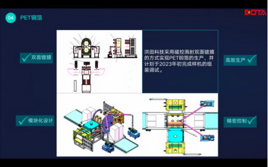 對此,洪田科技采用磁控濺射雙面鍍膜技術,通過模塊化設計完成對PET銅箔生產過程中的精密控制,計劃于2023年初完成樣機的組裝調試,預計明年3-4月做出PET銅箔樣品。